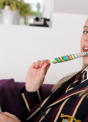Описание: Развалившись на диване в строгой форме и соблазнительно задирая стройные ножки в черных чулках, развратная сучка эротично сосет перед камерой длинный леденец и постепенно оголяет свое стройное молодое тело. Чувственно извиваясь всем телом, голая блондиночка с упругой грудью и аппетитной задницей безумно сильно хочет трахаться и похотливо подставляет крупным планом свою бритую готовую на все пиздёнку.