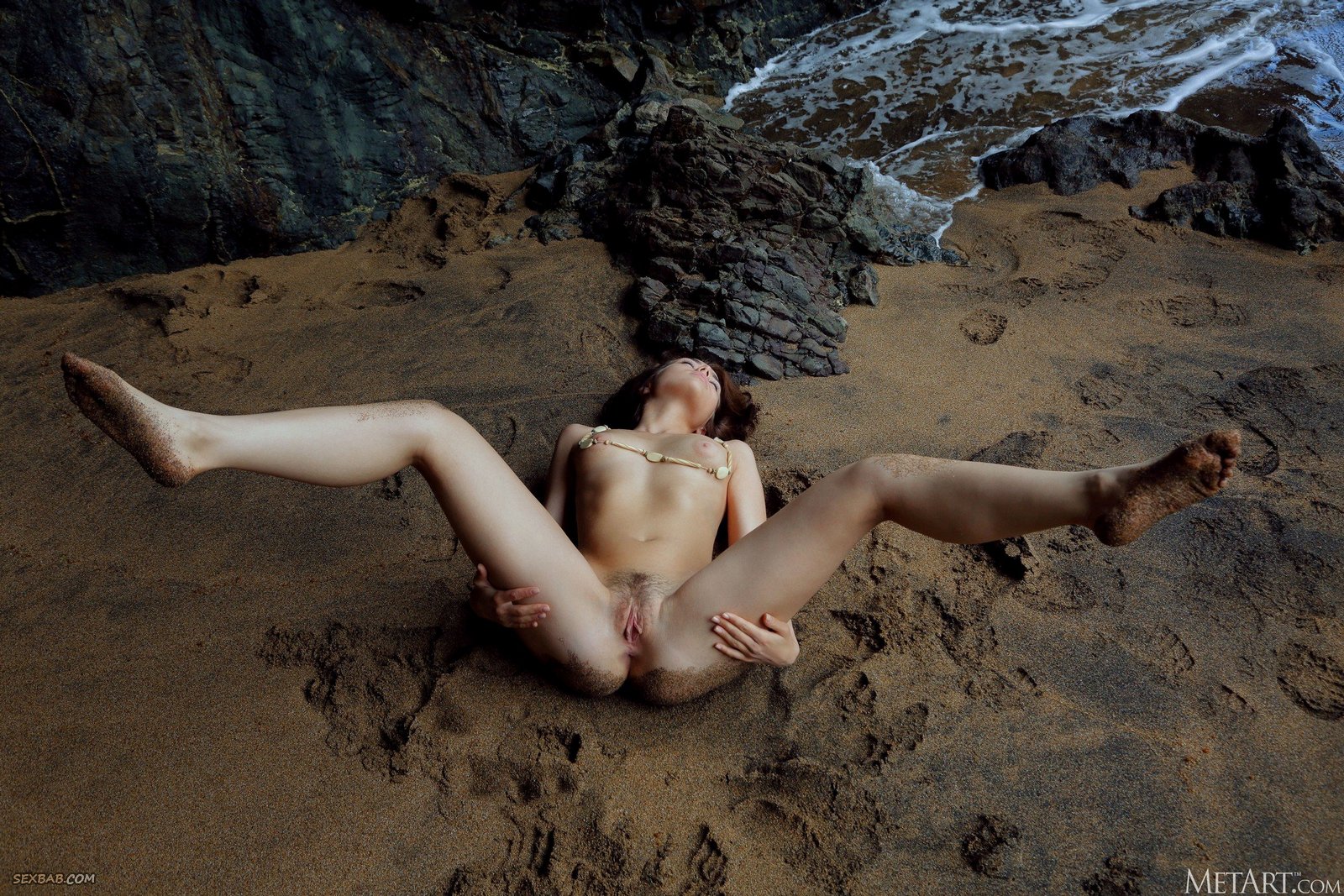 Описание: Возбуждающе светя своими миниатюрными острыми титьками с розовыми сосками, очаровательная голая нудистка с заросшей волосатой писькой развратно позирует на пляже, чувственно извиваясь всем телом на песке и выставляя на показ перед камерой свои испачкавшиеся интимные места.