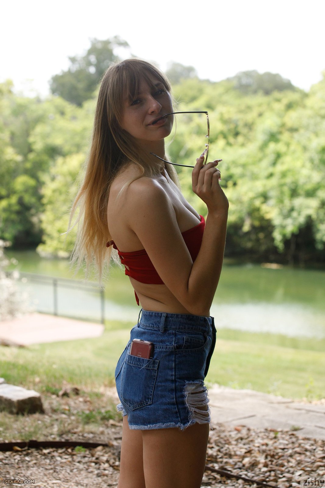 Описание: На берегу речки скромная девка в джинсовых шортиках переборола свои комплексы и неохотно показала свои большие висячие сиськи. А затем молодая блондинка стащила с себя всю последнюю одежду, оказавшись абсолютно голой перед камерой, но все равно детка стыдливо прикрывает все свои интимные места руками.