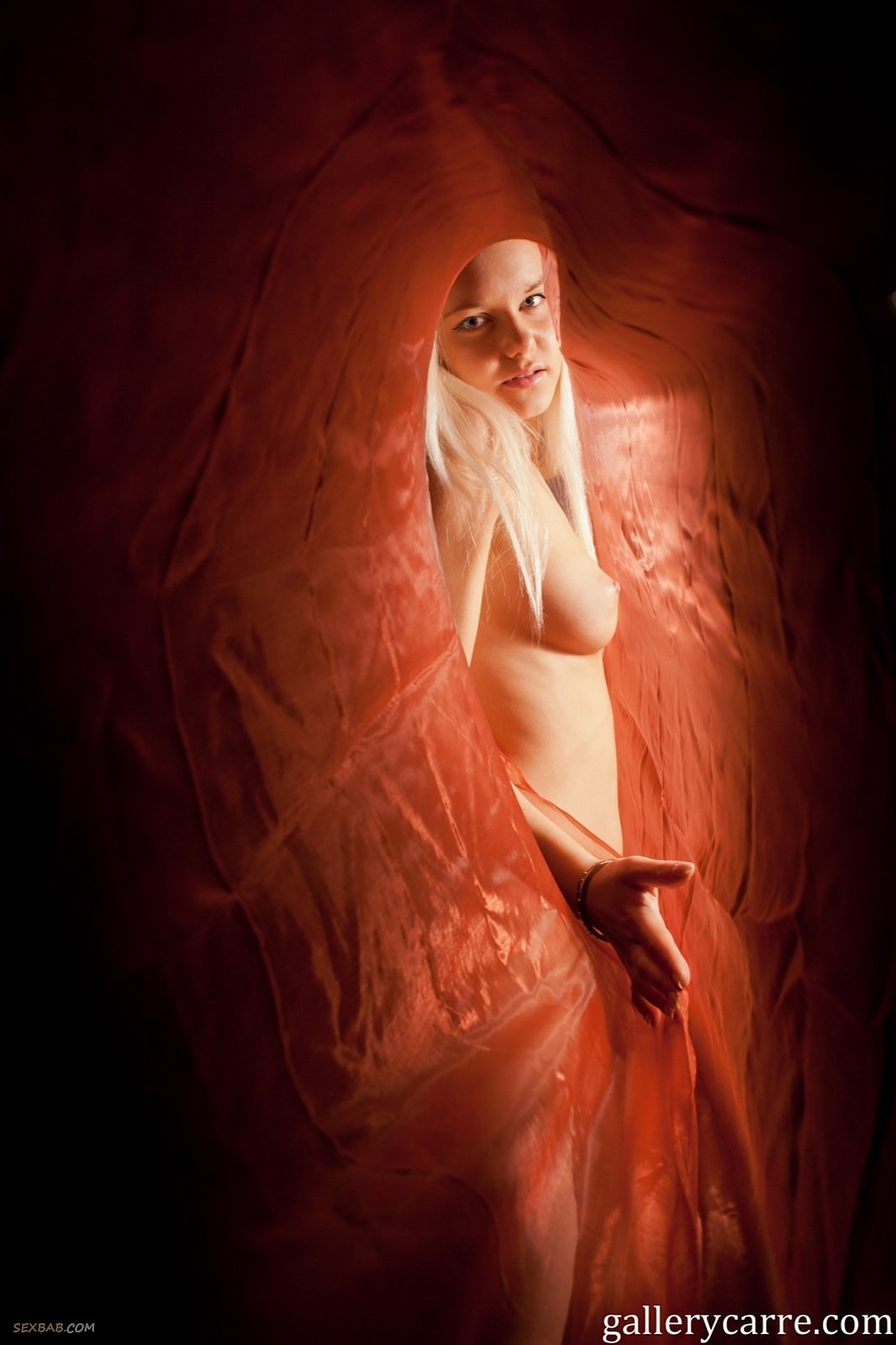 Описание: Расположившись под яркой тканью, молодая и полностью голая блондинка устраивает эротичную ню фото сессию, чередуя разные позиции и ощущая удовольствие. В процессе сексуальная девушка с натуральными сиськами показывала гладенькую бритую письку с лобком.