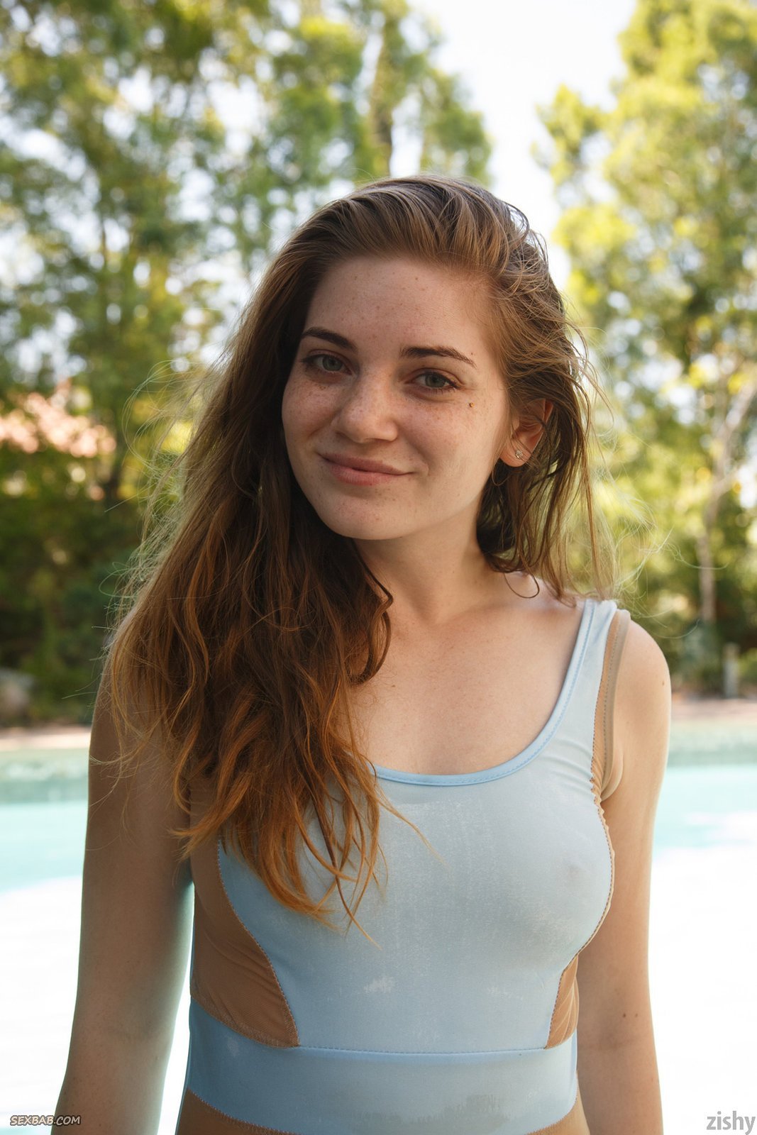 Рыжая девка в купальнике позирует рядом с бассейном