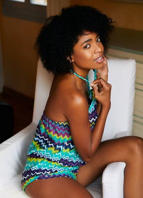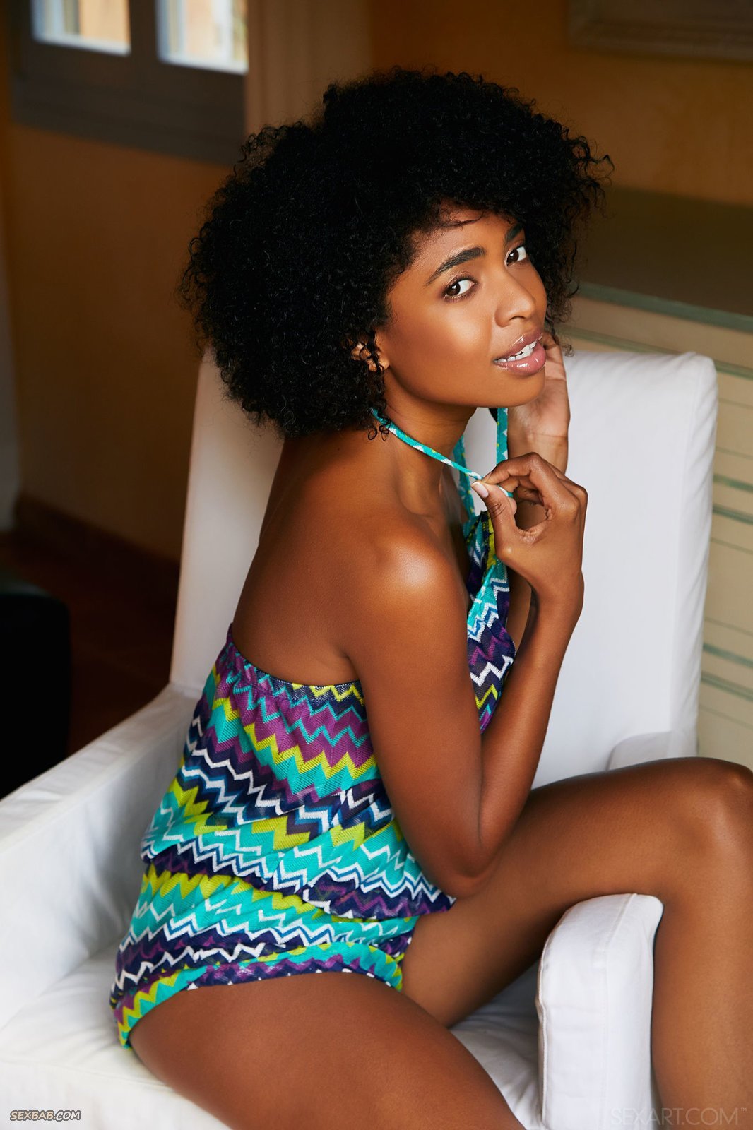 Стройная негритянка с упругой жопой позирует на стуле